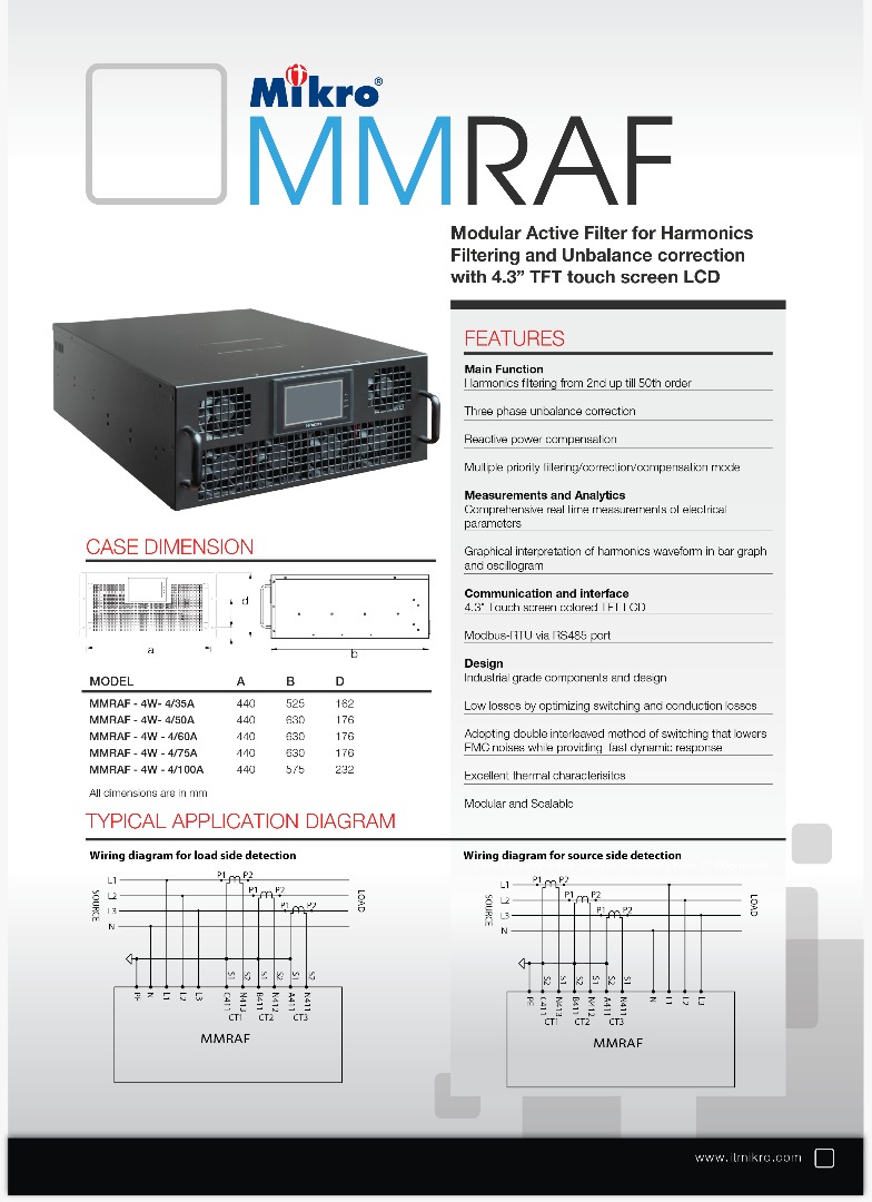 Bộ lọc sóng hài tích cực MMRAF Mikro do Thietbidien247.com.vn cung cấp lọc được nguồn sóng hài gây ra từ nguồn cung cấp cũng như từ phụ tải.Bộ lọc sóng hài tích cực MMRAF do Thietbidien247.com.vn cung cấp lọc được nguồn sóng hài gây ra từ nguồn cung cấp cũng như từ phụ tải. Trong hệ thống điện công nghiệp, có rất nhiều nguyên nhân tạo ra nguồn sóng hài, quan hệ phi tuyến giữa dòng điện và điện áp hoạt động là một đặc điểm chung của chúng. Tất cả các thiết bị biến đổi dạng sóng sin của dòng điện hay điện áp đều là nguồn gây ra hài.