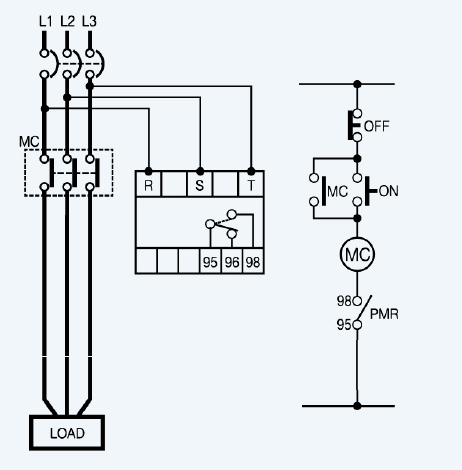 - Ở phần điều khiển mình sẽ xài tiếp điểm thường đóng (98, 95) nối như trong hình khi rờ le phát hiện mất pha thì sẽ chuyển thành thường hở ngắt cuộn hút của contactor ra và ba tiếp điểm thường hở của contactor sẽ ngắt tải ra để tránh hư hại.